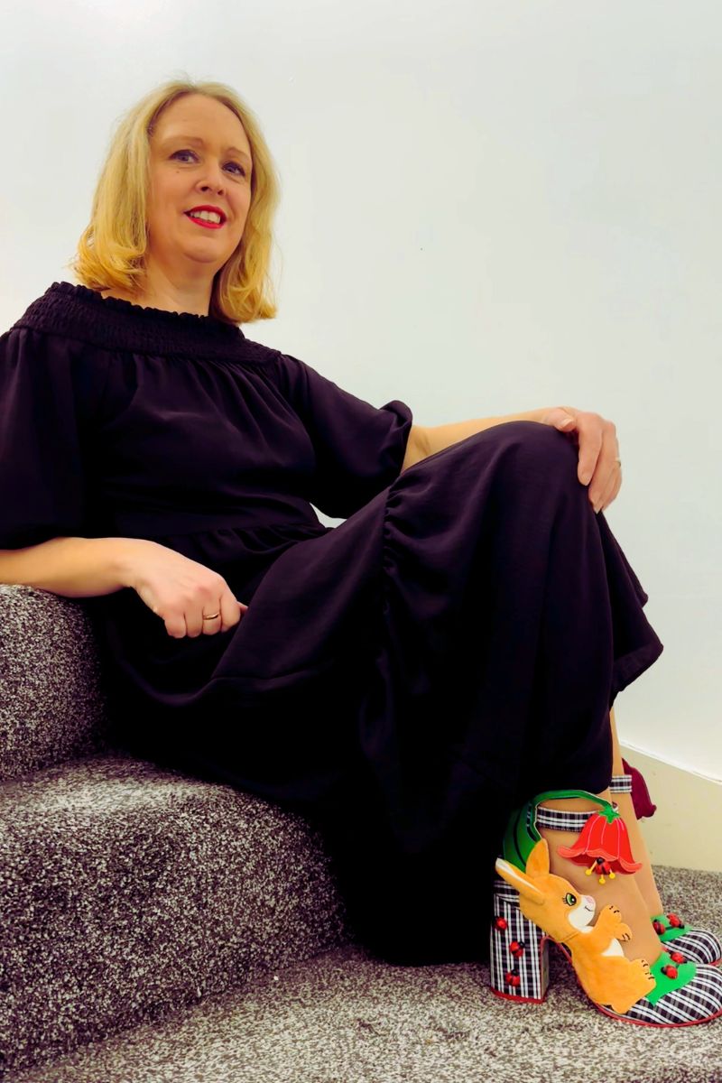 This affordable black maxi dress from a charity shop pairs effortlessly with my colourful Easter inspired Irregular Choice shoes.